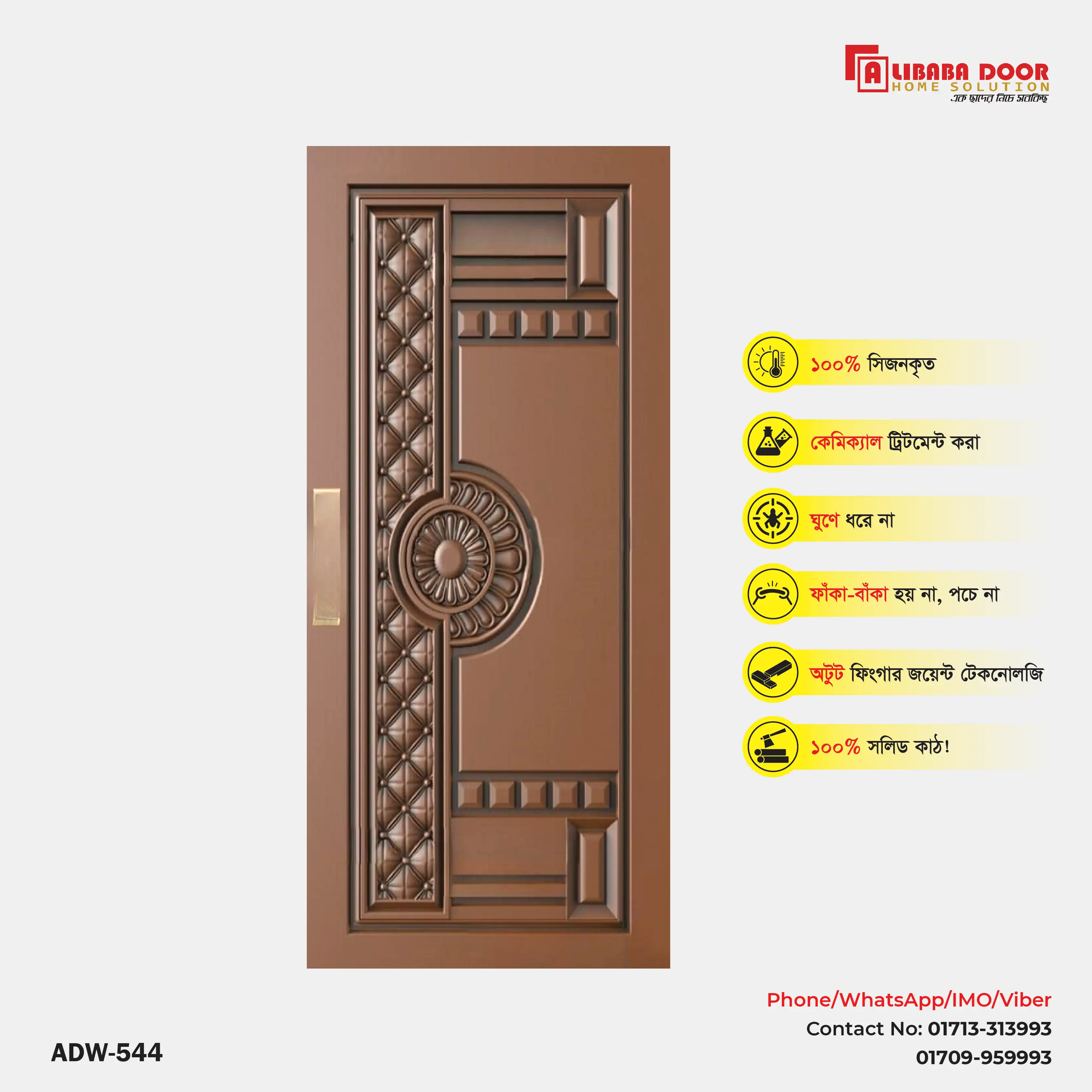 Strength, elegance, and durability were brought into perfect harmony with a solid wooden door ADW 544 from AliBaba Door & Home Solution. The best known types of wood are Burma teak, Chittagong teak, and Mahogany. This door has been designed so that it will continue serving your family, enhancing its beauty as well.