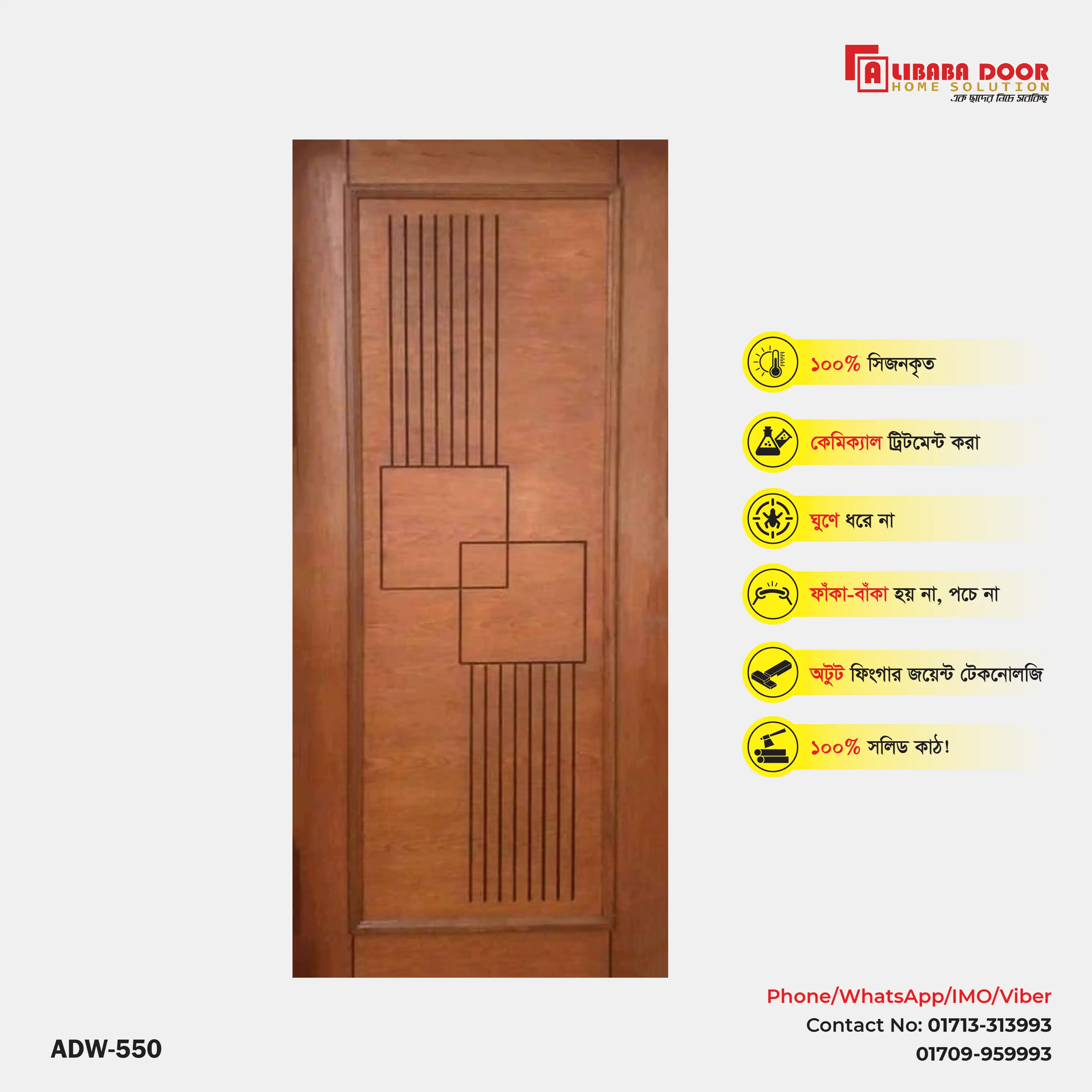 Strength, elegance, and durability were brought into perfect harmony with a solid wooden door ADW 550 from AliBaba Door & Home Solution. The best known types of wood are Burma teak, Chittagong teak, and Mahogany. This door has been designed so that it will continue serving your family, enhancing its beauty as well.